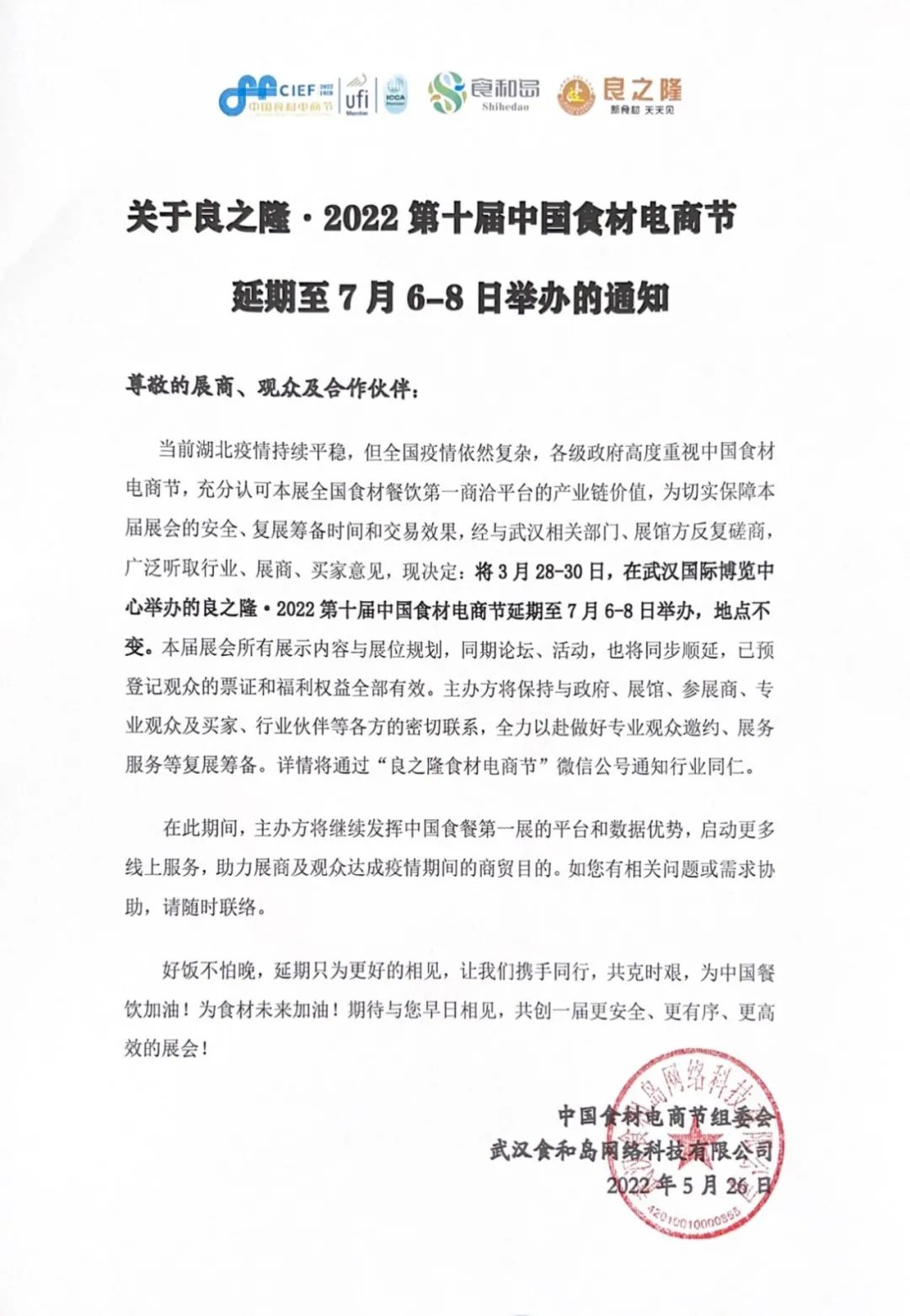 關于良之隆·2022第十屆中國食材電商節延期至7月6-8日舉辦的通知